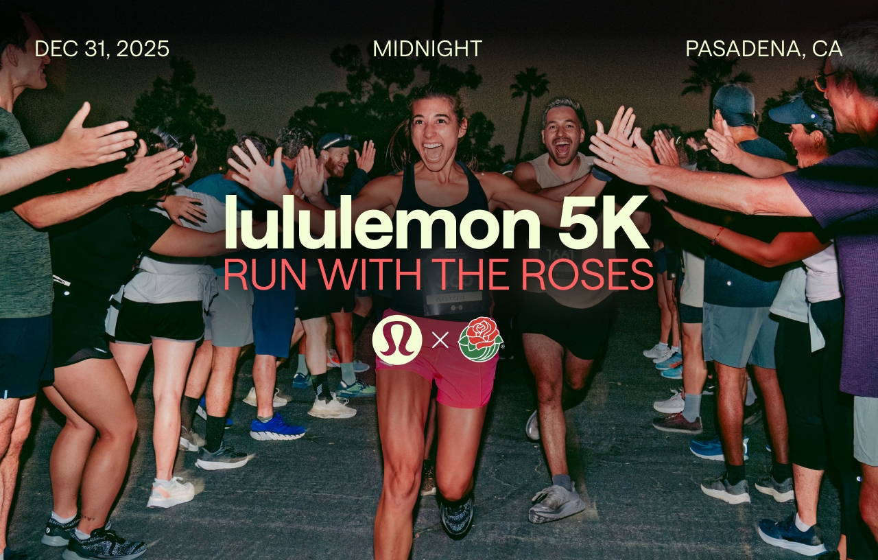 Join lululemon and the Tournament of Roses for the third year of the lululemon 5K Run with the Roses along the iconic Rose Parade route at midnight on December 31, 2205. All finishers will receive a race bib, complimentary race photography, a custom finishers medal, and invite to the post-race party, and more.