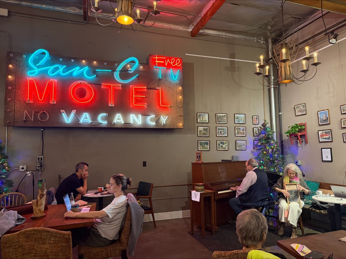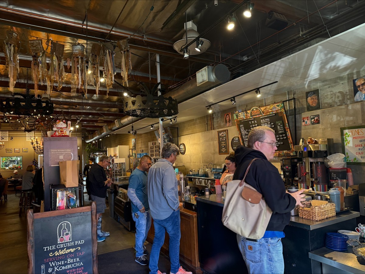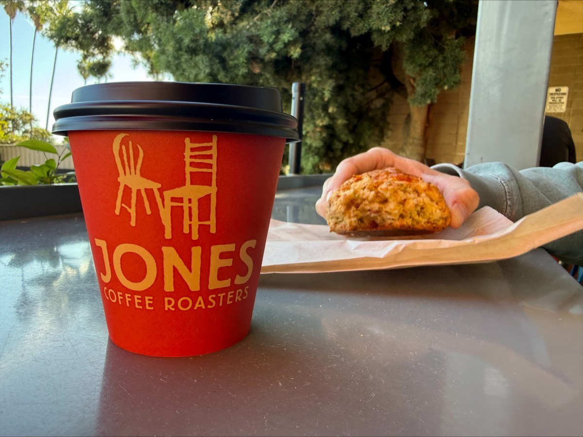 Jones Coffee is a family run coffee company headquartered in Pasadena, their roasting facility doubles as a coffee shop in a warehouse near ArtCenter College of Design's South Campus. Jones' staff roasts coffee on a vintage black and red Probat; from there, it's a short walk to the counter where a three-group La Marzocco espresso machine and Luxus batch brewers yield some of Pasadena's finest coffee.