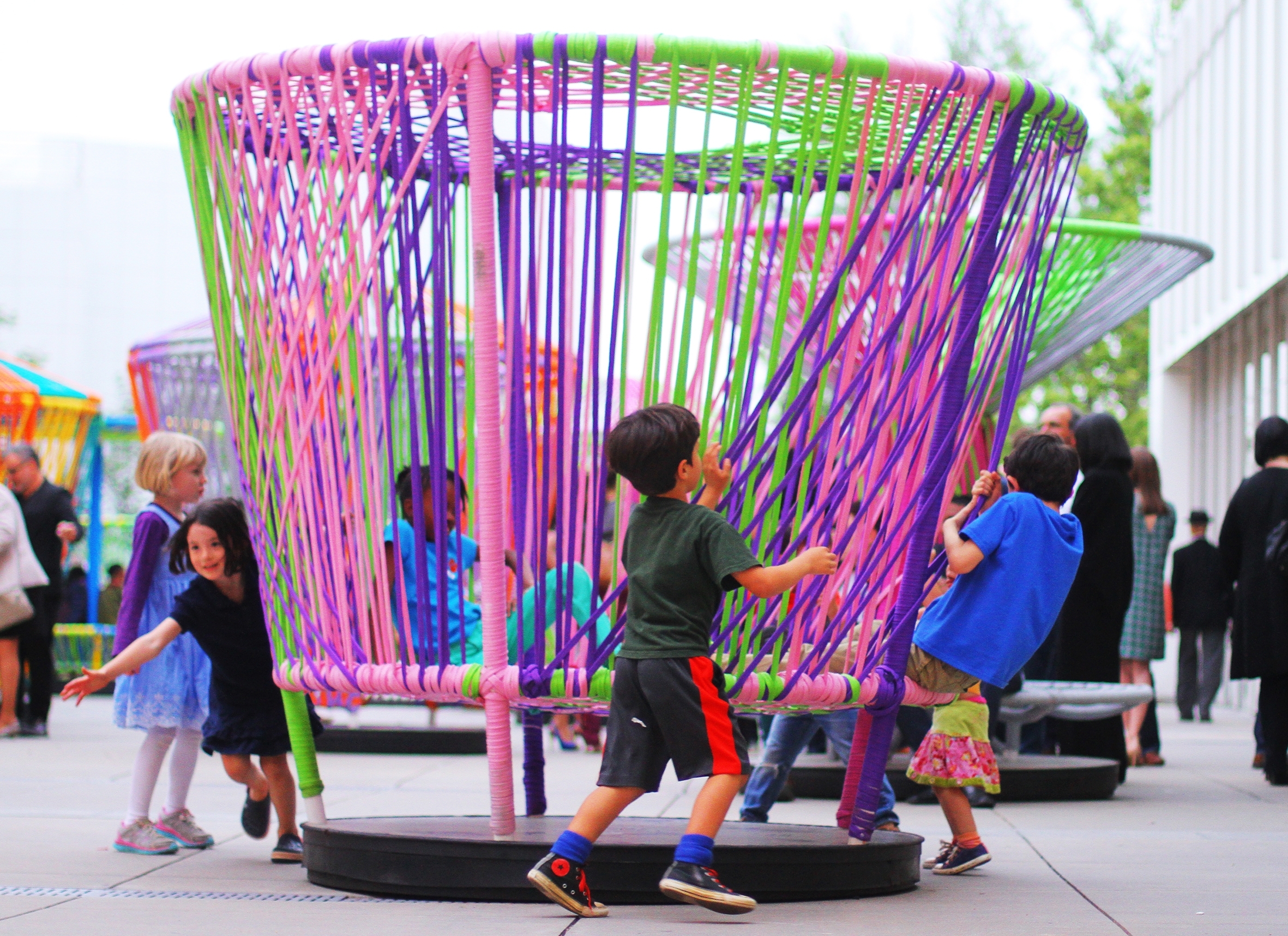 The installation, Los Trompos, first commissioned by the High Museum of Art in Atlanta, is a large-scale interpretation of vintage toy tops created in part by flat nylon rope woven in traditional Mexican style. Visitors can sit inside the vividly colored structures and work together to spin them on their bases.